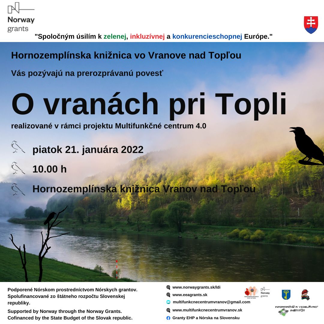 Hornozemplínska knižnica vo Vranove nad Topľou a Prešovský samosprávny kraj Vás pozývajú na prerozprávanú povesť O vranách pri Topli, ktorý sa realizuje v rámci projektu LDI 01004 Multifunkčné centrum 4.0 (Miestny rozvoj, odstraňovanie chudoby a inklúzia Rómov).